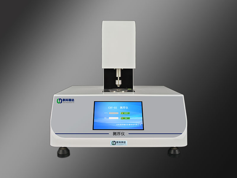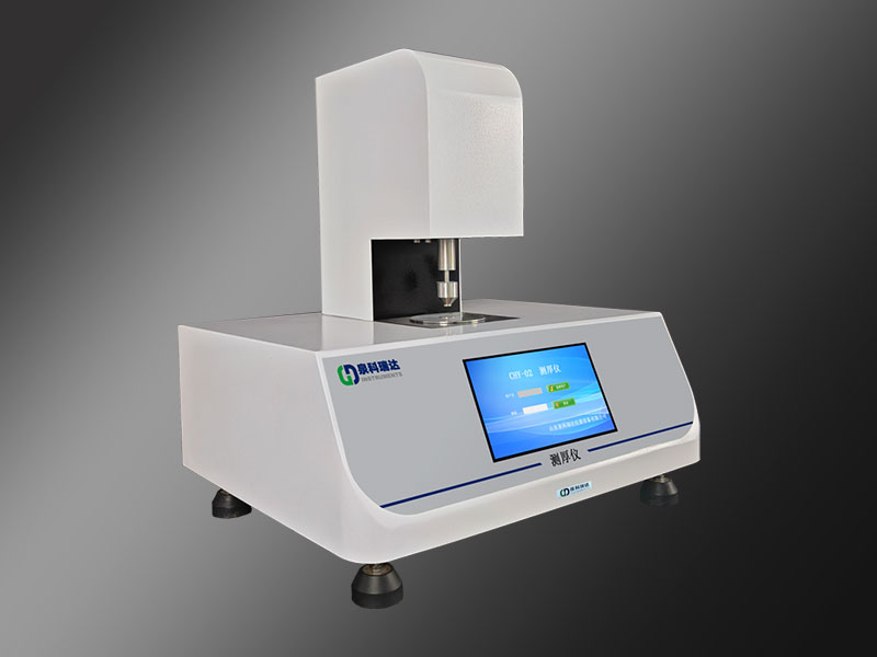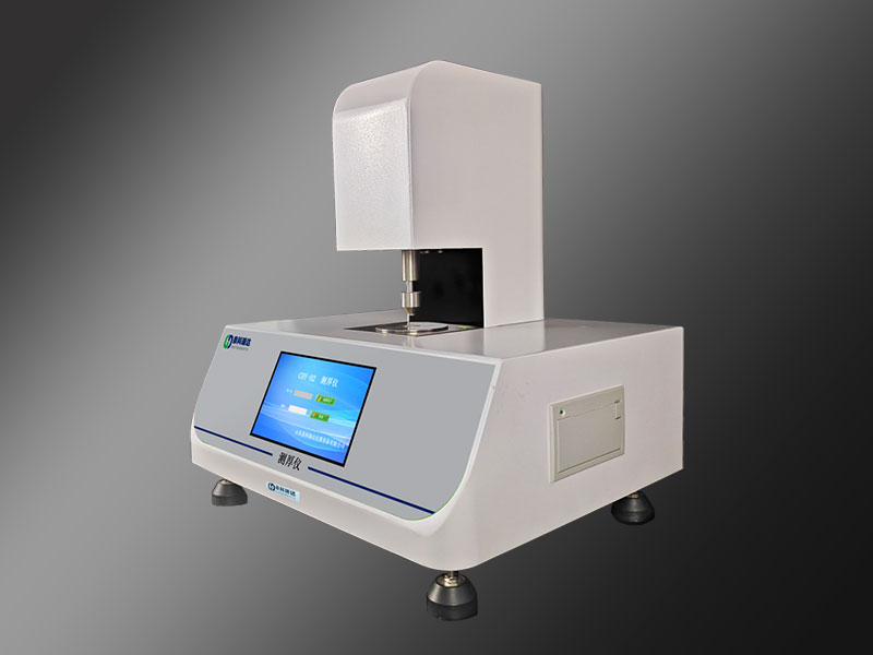本品不同于超聲波,電渦流等原理,采用機械接觸式厚度測量方式進行厚度的高精度測量,完全符合標準要求;將厚度測量頭復(fù)位后置零(測厚頭與測厚儀測試臺接觸歸零),啟動試驗,測厚頭達到最高位,將平整試樣置于測厚儀測試平臺上,測量頭下落后接觸試樣,對試樣施壓標準規(guī)定的壓力后通過位移傳感器記錄材料厚度。