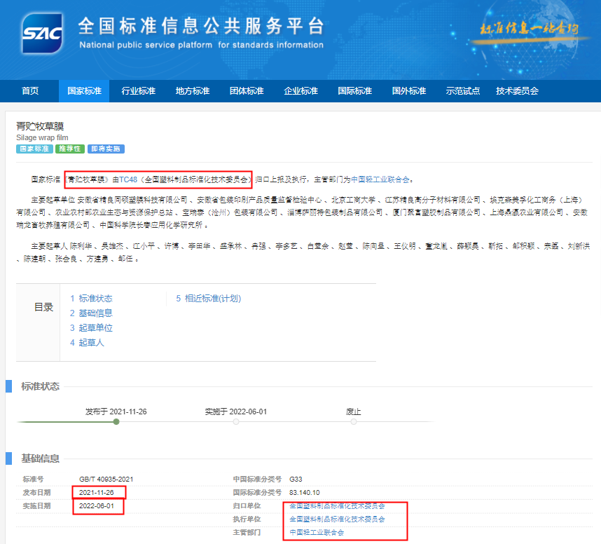 2021年11月26號(hào)國家標(biāo)準(zhǔn)《青貯牧草膜》(GB/T 40935-2021)由國家標(biāo)準(zhǔn)化管理委員會(huì)的《中華人民共和國國家標(biāo)準(zhǔn)公告》(2021年第14號(hào))正式發(fā)布,將于2022年6月1日起正式實(shí)施。