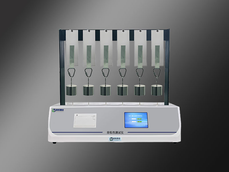 把貼有試樣的試驗(yàn)板垂直吊掛在試驗(yàn)架上,下端懸掛規(guī)定重量的砝碼,啟動(dòng)試驗(yàn)開始計(jì)時(shí),試樣在砝碼重力下被拉脫時(shí)計(jì)錄整個(gè)完全脫離的時(shí)間來衡量膠粘帶抵抗拉脫的能力;亦可測試經(jīng)過指定時(shí)間后試樣粘脫的位移量進(jìn)行膠粘制品持粘性評(píng)定(人工測量)。